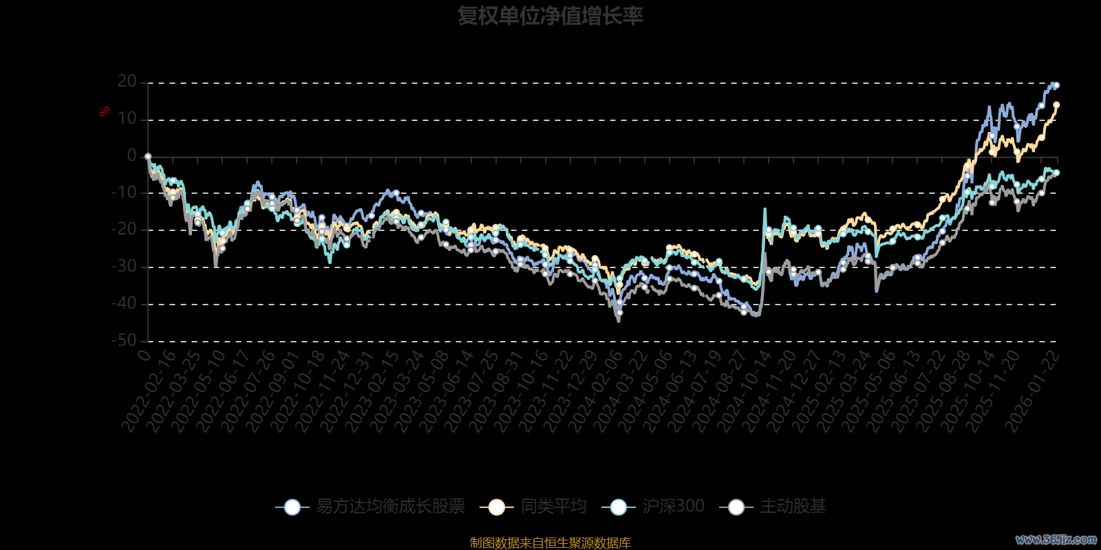 截至1月22日,易方达均衡成长股票近三个月复权单位净值增长率为11.00%,位于同类可比基金25/58;近半年复权单位净值增长率为49.52%,位于同类可比基金6/58;近一年复权单位净值增长率为74.60%都优配送端,位于同类可比基金3/57;近三年复权单位净值增长率为32.96%,位于同类可比基金28/57。
