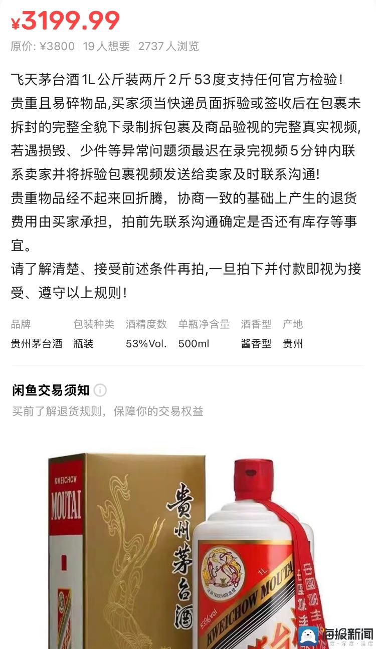 在二手平台,也有不少消费者出售1L飞天茅台,咸鱼平台显示多个链接价格出现下跌,二手市场的出手售价在3199元/瓶至3499元/瓶左右,多位消费者表示可以接受“小刀”。