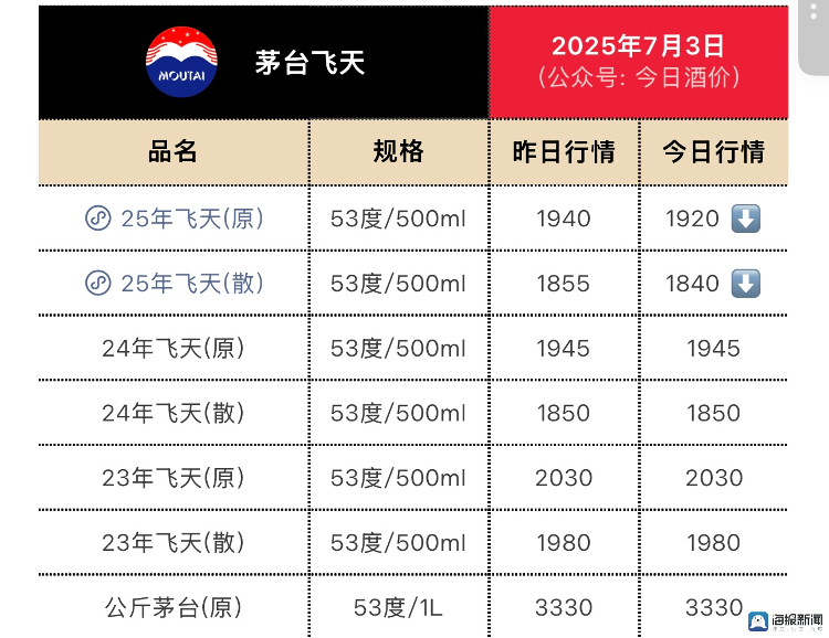 今日酒价数据显示,7月3日,500ml53度飞天茅台单瓶批发价为1840元/瓶,1L装茅台的批发价为3330元/瓶。