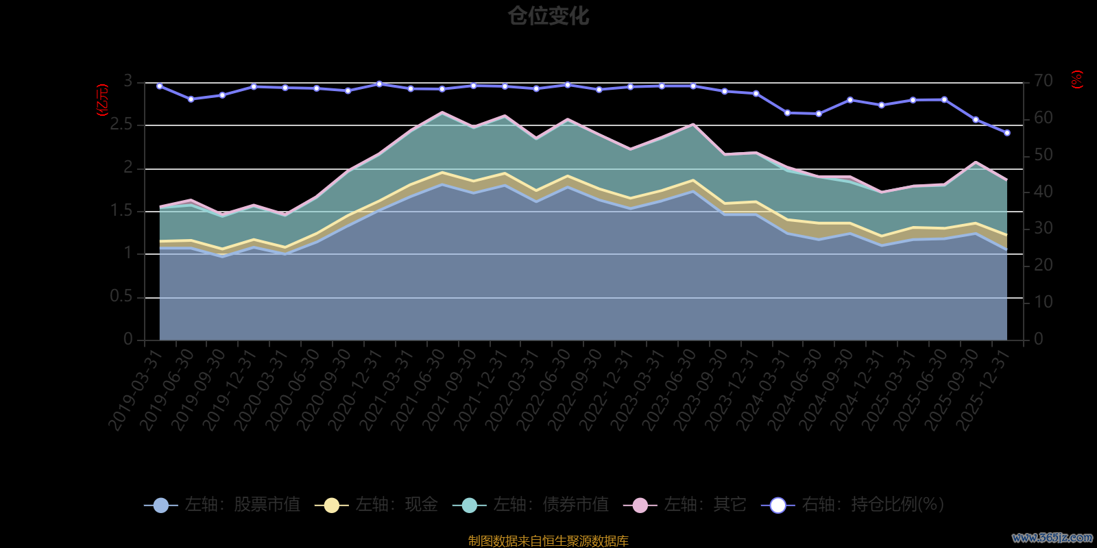 据定期报告数据统计,近三年平均股票仓位为64.25%,同类平均为67.52%。2020年末基金达到69.52%的最高仓位,2025年末最低,为56.26%。